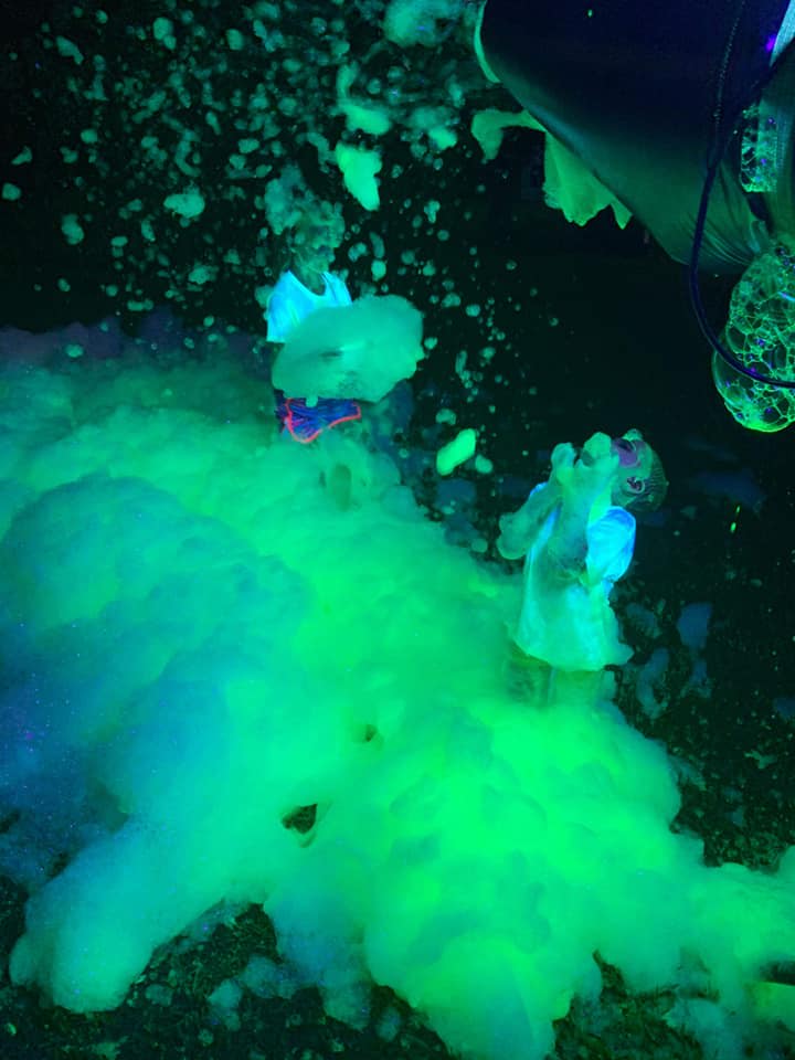 Glow Foam Party Package take your event to the next level with Tons of Glowing Bubbles. With this package you add our special UV additive to make the regular Foam Glow in the Dark. Depending on what setting you chose on the Foam Cannon your event could last between 1 to 3 hours. This Glow Package comes with enough solution to make 100 gallons. This Package should cover a 20 x 20 area stacking at 2 ft. high. Our specialize Foam Solution is Hypo Allergenic, will stain your clothes, will not damage your lawn, Its non toxic and will not burn your eyes. We recommend swim goggles to avoid them rubbing eyes to the point of making them irritated because they keep rubbing them with a towel.
